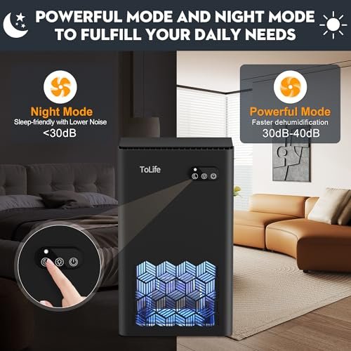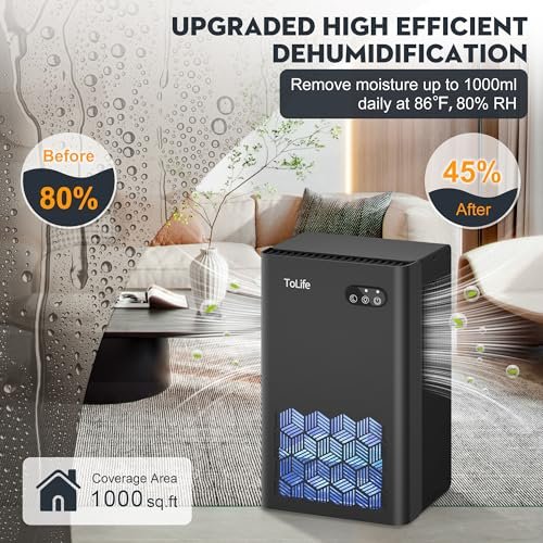 - UPGRADED HIGH EFFICIENT DEHUMIDIFICATION: ToLife dehumidifier utilize semiconductor condensation technology, ensuring quiet operation while effectively extracting moisture from the air. This advanced feature helps keep humidity levels below 45%